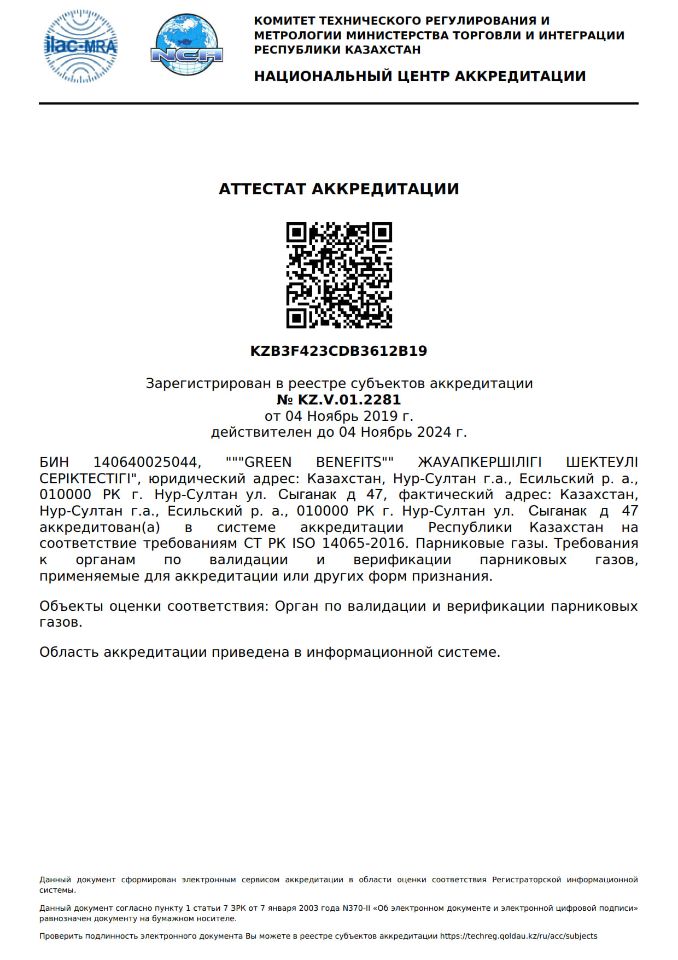 Согласно Экологическому кодексу Республики Казахстан главы 9.1 статье 94-2 оператор установки до первого апреля первого года действия Национального плана распределения квот на выбросы парниковых газов, утвержденного на соответствующий период, предоставляет валидированный план мониторинга выбросов парниковых газов и верифицированный паспорт установки в уполномоченный орган в области охраны окружающей среды, а также верификационный отчет об инвентаризации выбросов парниковых газов.